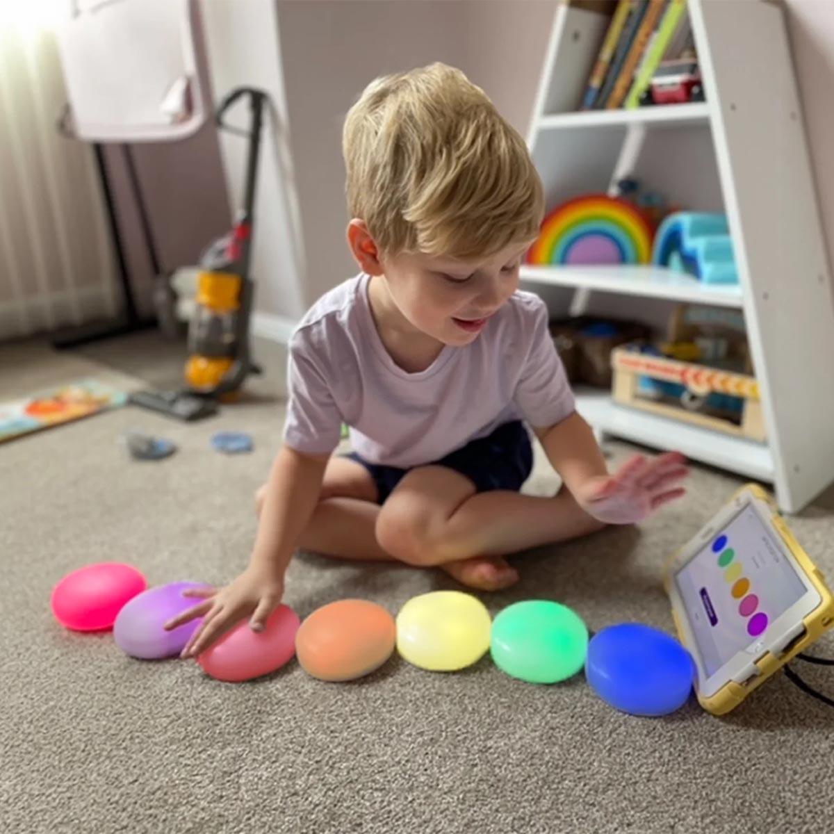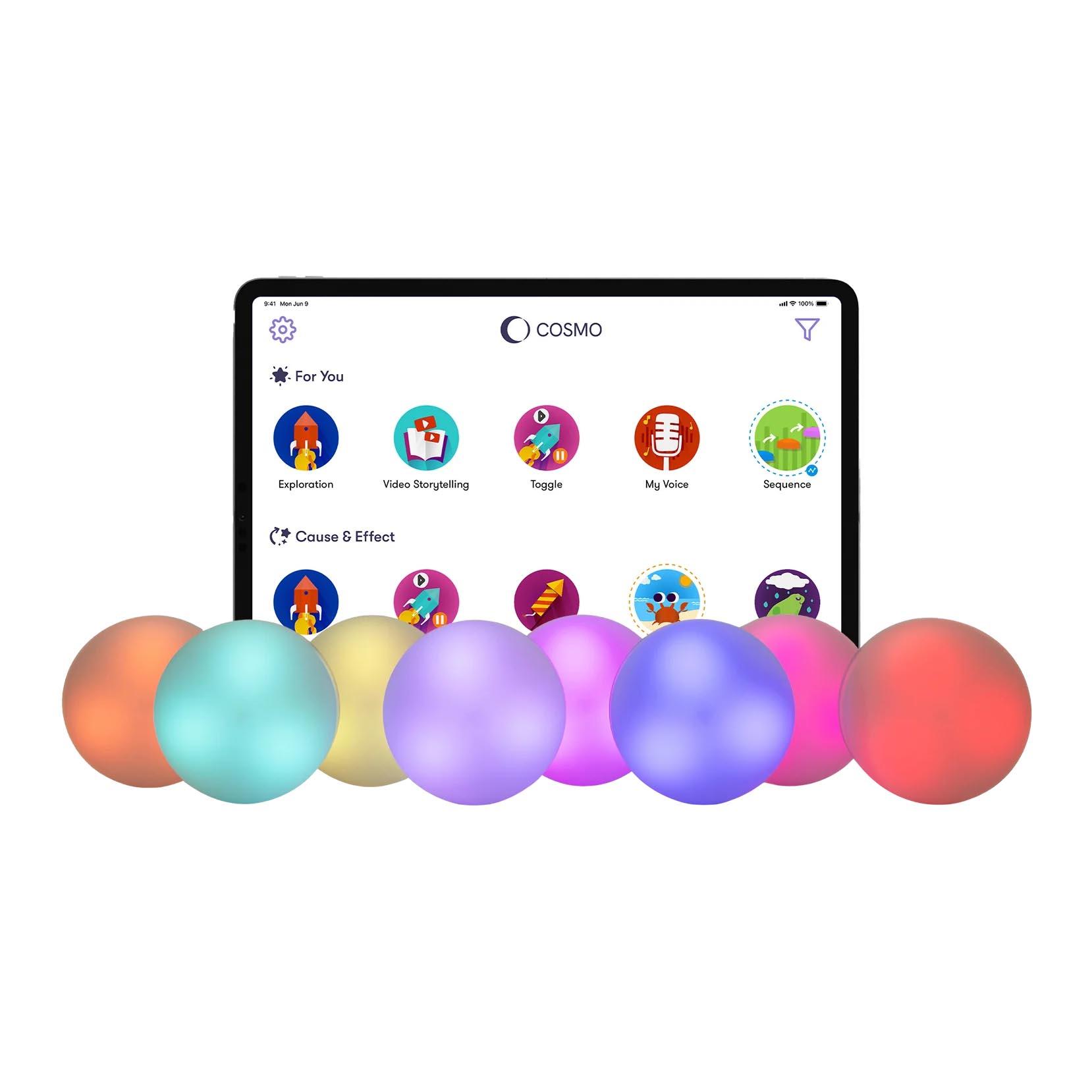 The Cosmo Learning System is a full, play-centred learning and therapy solution that combines a set of 8 Cosmo Dots, along with a rich library of multiple app activities grouped into themed learning suites.