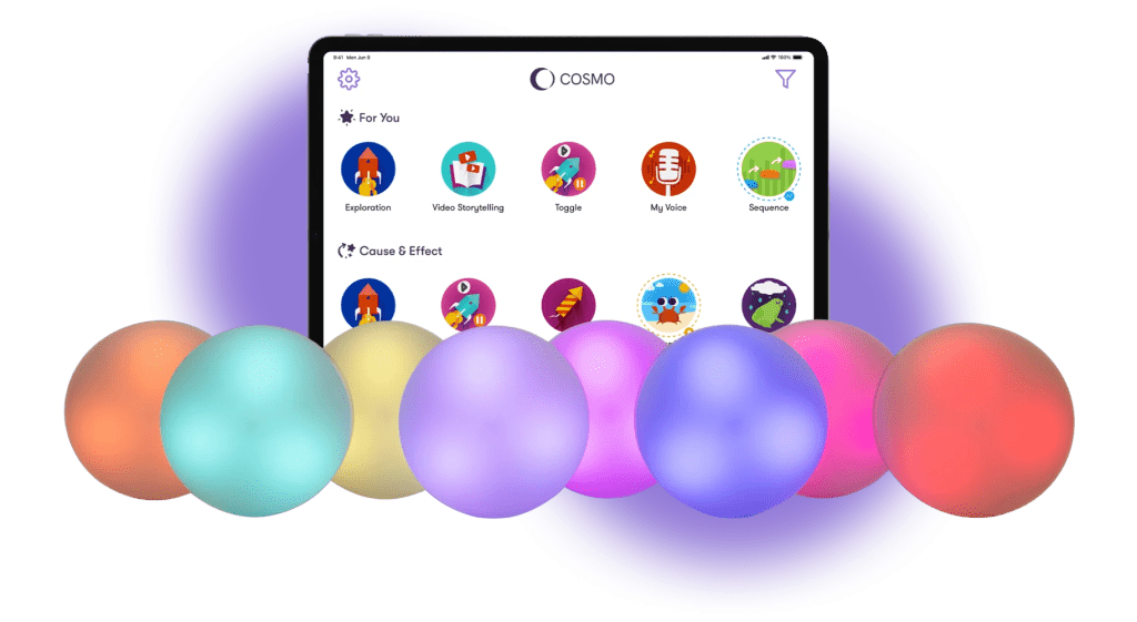 The Cosmo Learning System pairs the app with 8 interactive Dots to make learning playful and inclusive. Activities are grouped into suites, each focused on a key learning area.