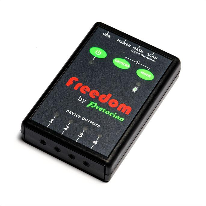 Freedom is a four-channel device switcher that allows one switch to be routed to up to four devices, allowing a disabled user to select for him/herself which device the switch is to be used with at any point in time. Selecting the device can be achieved either by an extended press of the input switch, or by momentarily pressing a secondary select switch (where the user has the motor capabilities to operate two switches). Where an extended press is to be used, the duration of the press may be programmed from the keypad.